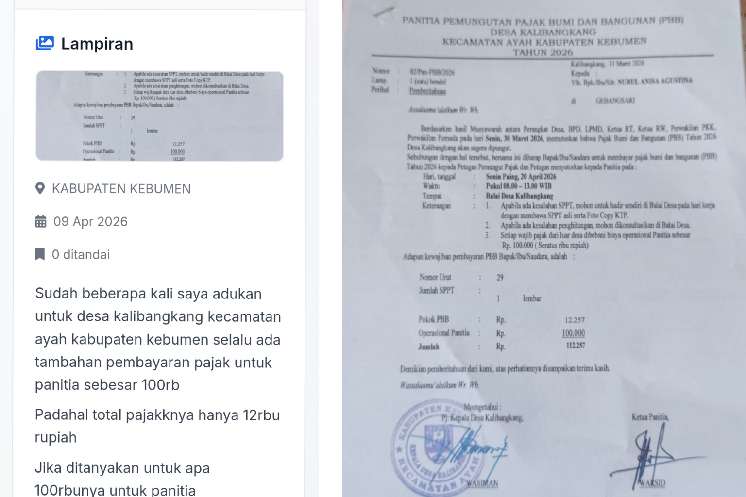 Dalam surat bernomor 02/Pan-PBB/2026 tertanggal 31 Maret 2026 itu, terlihat rincian tagihan di mana “Pokok PBB” warga hanya sebesar Rp 12.257. Namun, di bawahnya tertera kolom “Operasional Panitia” sebesar Rp 100.000. Sehingga total yang ditagihkan melonjak drastis menjadi Rp 112.257.